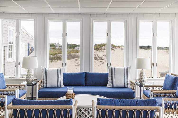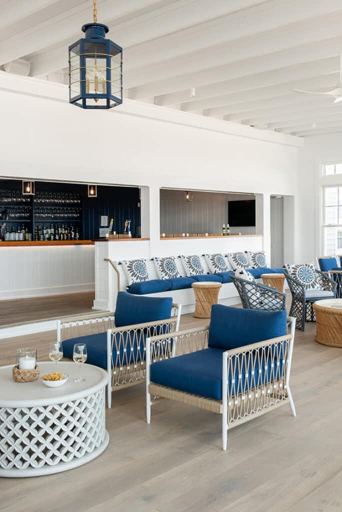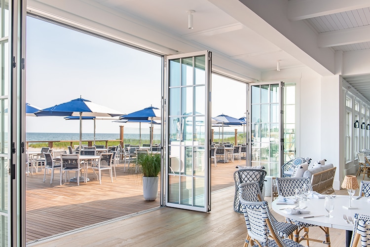 Expansive NanaWall systems replace former openings, allowing entire walls to fold away when weather permits, which the design team, the board and the members all emphasize the positive and dramatic effect that choice allowed. When open, the dining room once again reads like the original piazza—an extension of the deck and beach beyond, and truly blurs the lines between the physical structure of the Club and the natural coastline. When closed, the room remains luminous and weather-tight, offering year-round sophistication without sacrificing coastal informality.