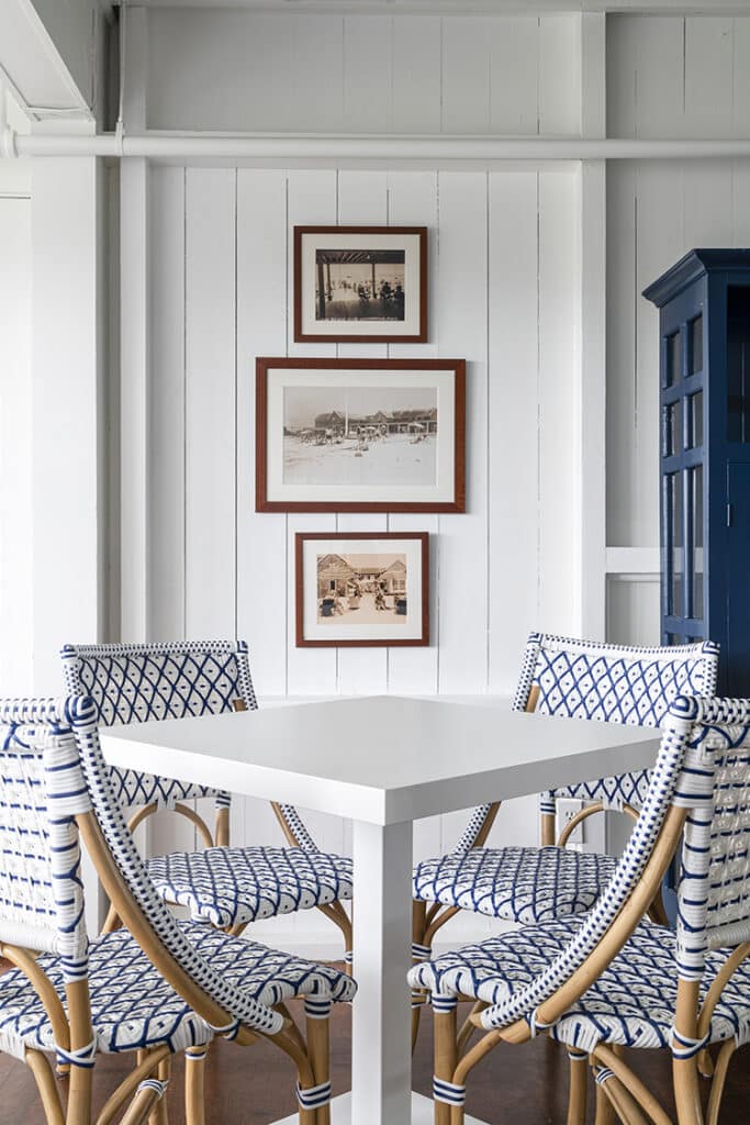 Furniture selections were equally intentional. Dining chairs—customized to be stackable and structurally reinforced—feature blue-and-white woven backs that subtly elevate the room. They are not the predictable French bistro form. They are familiar, yet refined.