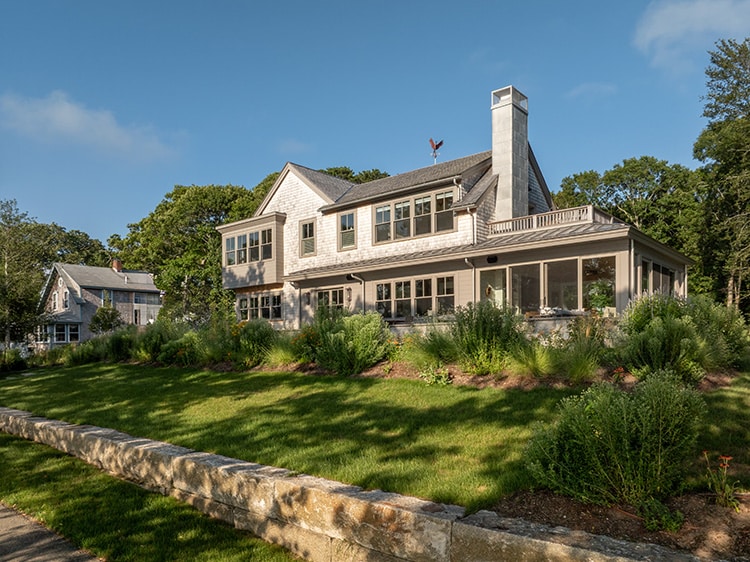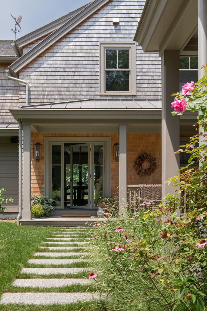 That sensitivity to time and evolution is evident in every corner of the house. From the street, its presence is deliberate but restrained. Though larger than some of its neighbors, it neither looms nor dominates. Instead, it settles quietly into the land, helped by a series of design decisions that reduce its massing: the garage was detached and connected only by careful pathways; the screened porch sits lightly at one end, breaking up the volume; a belt course of trim suggests a story-and-a-half scale; and the natural shingles were chosen to weather into the same silvery gray as the tree trunks that surround it. Even the trim was considered—painted not a sharp white but a muted tone, anticipating the driftwood gray of the shingles so the house would recede rather than shout. “This is about being recessive,” Hutker explains, “about quietly sitting in the landscape.”