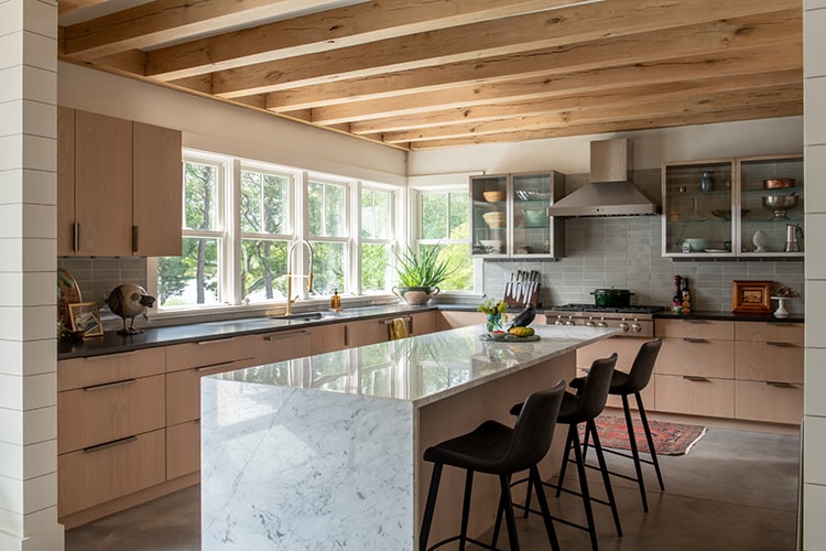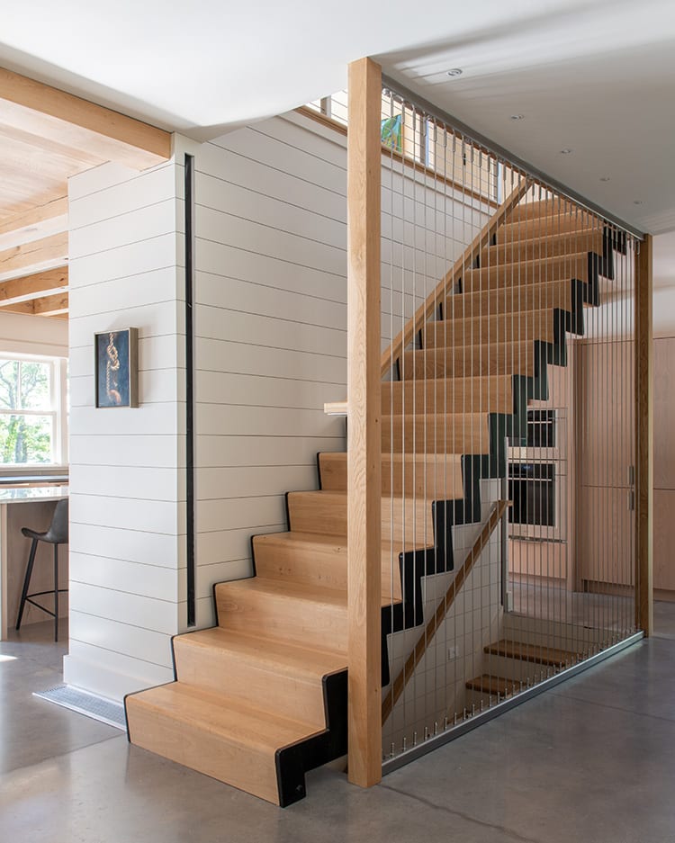 Inside, the house tells its story through materials, many of them carrying echoes of the family’s heritage. For generations, they have been connected to the craft of boats, and that influence is unmistakable. Cable railings evoke lifelines strung along a sailboat’s deck. The stair’s structural stringer zigzags like the hull lines of a vessel, its rails constructed from hardware more often found in a boatyard than a living room. The mix of wood and metal reappears throughout—stainless steel upper cabinets in the kitchen balanced by warm oak beams that stretch across the ceilings. “There’s this sense of boat building,” Hutker says. “The combination of metal and wood was really important to the house, and the details play into that narrative.”
