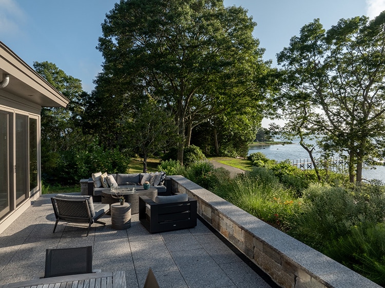 Details large and small distinguish the home. Kevin Schreur,  one of Hutker’s talented and innovative project managers designed the floating oak staircase; its treads folded over steel supports, appears to cascade downward like a waterfall, the risers angled back slightly to create movement. Vertical wire balustrades extend from floor to ceiling, a modern riff on maritime rigging. On the landing of both staircases (to the second floor as well to the lower level), custom counter-weighted gates recessed into the walls can be pulled across stairways with a fingertip, serving as both dog barriers and child safety features, cleverly designed for ease of use by a toddler or a grandparent. A custom walk-in wine room, and a built-in cigar humidor, crafted by Cataldo’s project manager, Peter Sarkinen, occupy what might once have been a simple office. Outdoor terraces unfold in layers: first a stone wall, featuring massive stone blocks sourced from pier revetments, screen the road, then a second retaining wall that elevates the living spaces to fully take in the harbor view. Between them, a lushly planted slope softens the transition, so that from inside the house the street all but disappears.
