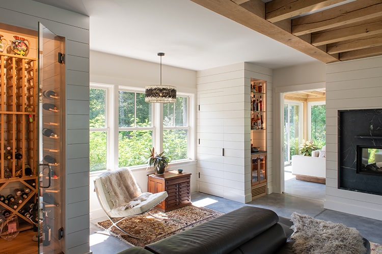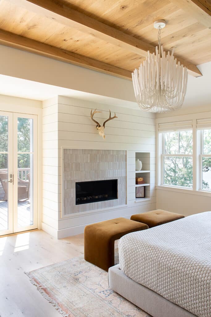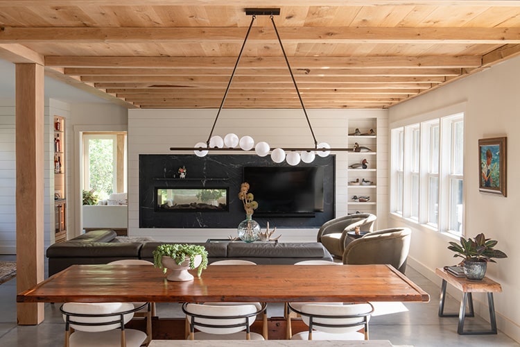The heart of the home is unquestionably the kitchen, where the wife, a devoted cook, commands the space. Stainless steel upper cabinets with glass fronts line one wall, paired with a stone island with a waterfall edge which was fabricated by Discover Marble. Polished concrete floors and wood beams frame the scene, while expanses of glass open the room to the harbor beyond. For the homeowner, cooking is not just a chore but her expression of care, and the space was designed with that in mind. Friends who have gathered there for dinners describe evenings filled with warmth, laughter, and the glow of sunsets sinking behind the moorings. The living room is separated from the three-season porch by a wall of shiplap paired with a massive slab of dark gray soapstone that features a two-sided gas fireplace insert. On the other side of the wall, in the porch area, the wall is clad in weathered copper and the floating Visual Comfort pendant, encircled with an orbit of LED light, adds to the marriage of modern and rustic materials in the space. Hutker notes that the couple’s daughter, collaborating with project manager Sarah Soltes, was actively involved in decisions about finishes, an intentional gesture toward the home’s future. “If you want your children to love a house and return to it,” he observes, “you involve them in shaping it.”