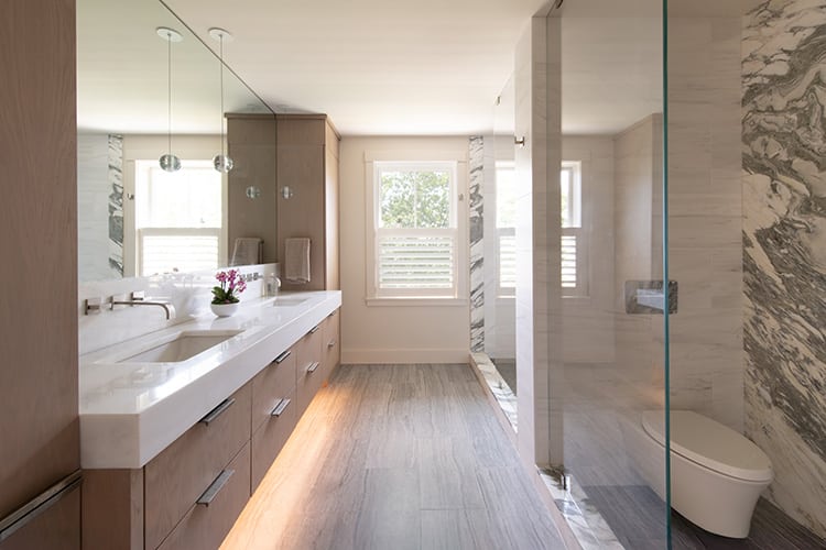 Concrete floors polished to a soft sheen run throughout the main level, warmed by radiant heat. The choice was both practical—durable enough for an avid outdoorsman and his large hunting dog—and esthetic, echoing the smooth stones of the shoreline. Rugs soften the acoustics and define spaces, but the underlying material grounds the house in something elemental. In the bathrooms, by contrast, luxury is found in stone slabs that stretch floor to ceiling, transforming showers into sculptural spaces. The homeowner herself made nearly all the interior selections, from the jewel-box powder room to the dramatic black quartz fireplace wall, balancing contemporary edge with coastal warmth.