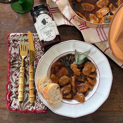 • In a sauté pan over high heat, add butter, and allow it to melt and brown, about 5-6 minutes. Add fresh sage leaves and Cinnamon & Spice Cranberry Apple Jam. Stir to combine. Remove from heat and add in the cooked pasta, toss to combine.