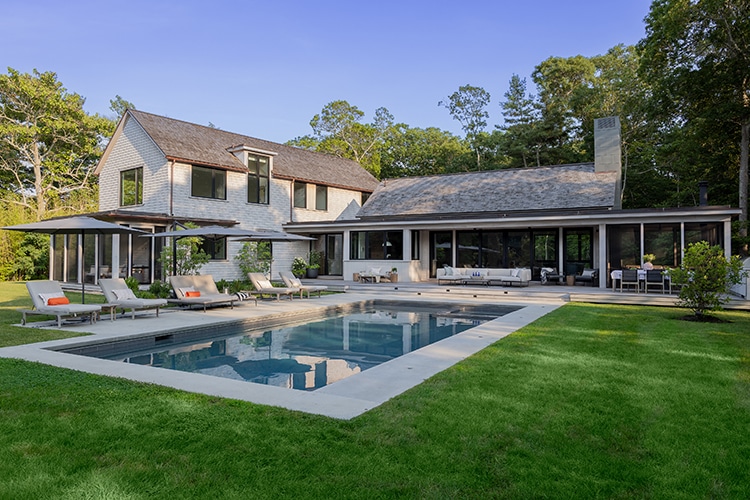 For Lori, childhood summers at camp had imprinted the scent of pine and earth as the equivocation of the smell of happiness. For Dave, weekends in the western mountains of Maine instilled a love of woodsy seclusion and unbridled adventure. Both adored the Cape’s shingled vernacular as it harbored memories of summers spent on the Cape and other seaside destinations. For Wellesley-based architect Jacob Lilley, bringing those visceral and rooted notions to life as a home for this blended family’s future was a dream project that became a successful reality. At the heart of the plan: a home that “lives around the pool.” Lilley prioritizes the various natural elements that influence the site this way, “There is no denying that this is a Cape house, in every sense of the word. It is used primarily as a weekend home—throughout the majority of three seasons. The water is never too far away on Cape Cod, but this home does not benefit from a water view, so we felt it was important to incorporate a compelling water feature within this program.” From the living room, the kitchen, or the primary suite, views draw attention and beckon outward to the water’s edge, with the house itself forming a sort of “L” that embraces everything the backyard offers.