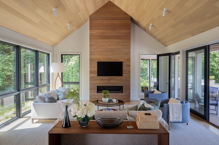 Inside, Liz Stiving-Nichols and her team at Martha’s Vineyard Interior Design brought warmth to the contemporary lines. She describes her firm’s philosophy—which has established her place with clients on the Vineyard, the Cape, and beyond for more than 15 years—as “a thoughtful approach, where every piece has a reason for being there. We don’t follow trends. We respond to our clients, the architecture, and the environment.” For this home, that meant emphasizing low, unobtrusive furnishings so that nothing interrupted sightlines between kitchen, living room, and the outdoor spaces, especially the pool. “We wanted to be able to stand in the kitchen and look across to the walnut fireplace, the expansive windows, and the greenery beyond,” she explains.