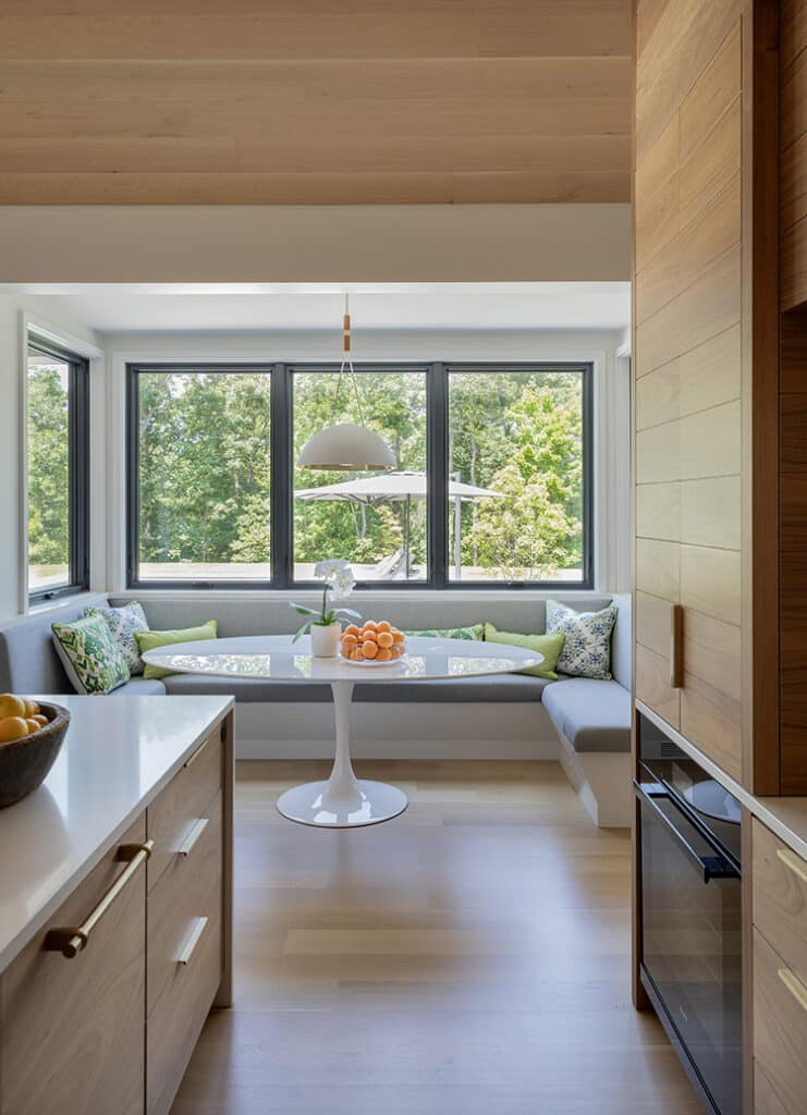 Though Lori jokes about not being an avid cook, the galley-style kitchen suits her perfectly. “I grew up in New York City—galley kitchens are all I’ve ever known. It’s comfortable for me,” she laughs. The scale and increased function of the kitchen keep this galley layout from feeling cramped. The design expands and achieves the optimal “Kitchen Triangle” with a wall of cabinetry, a spacious pantry, and a light-filled breakfast nook that Dave insisted be added. “That bump-out with the oval table—it’s where the kids eat lunch, where friends gather. It’s functional and cozy,” he explains.