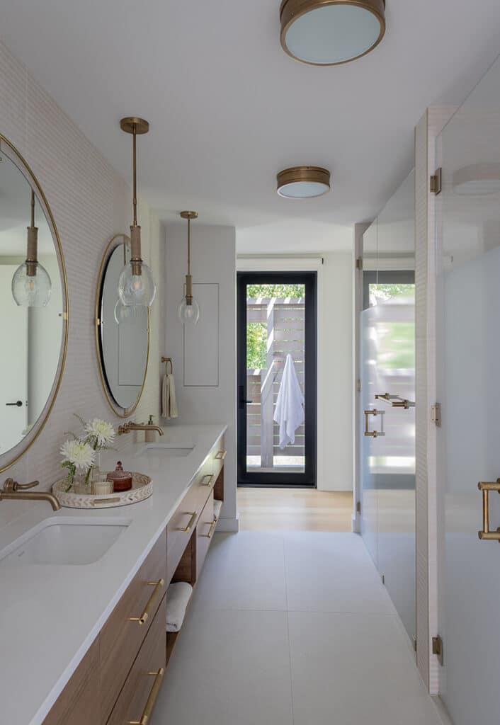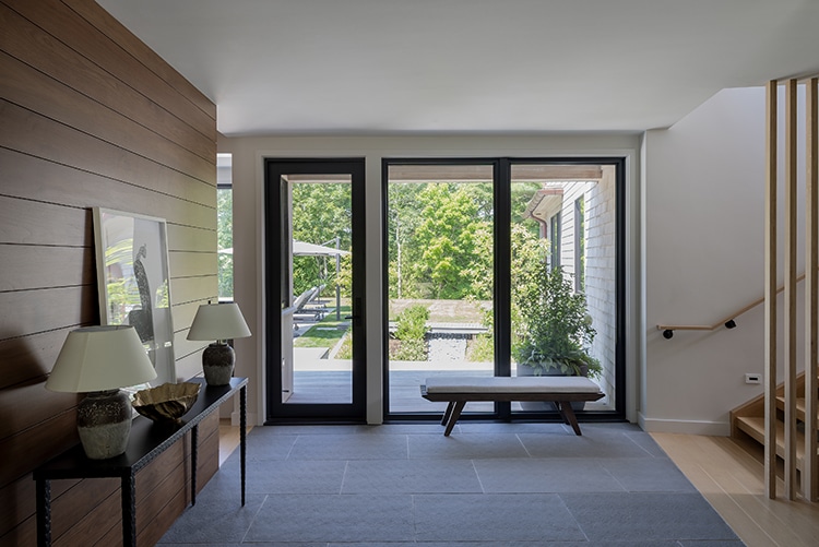 Landscape architect Tom Lee saw the site’s interplay with the architecture as an opportunity to blur the lines between living inside a home, and connecting with the natural world outside. “Jacob Lilley’s design offered such an opportunity to seamlessly connect the exterior elements with the interior living experience,” Lee states and Lilley concurs as he says, “We wanted a synergy between house and landscape.” At the core of that connection is the unique entryway to the home that also serves as a transitional hub—for everything from traffic, to access and activity, as well as even influencing a change in vibe and spirit. Framed with glass on opposites sides, the entry is immediately understood upon approach since sitelines pass through the front door, through the opposite wall of glass into the backyard beyond. Lee explains that the act of passing through the landscape, via bluestone pavers, naturally connects through the entryway (also paved in bluestone), to the access to the backyard where a dry riverbed of stone winds through plantings like a natural watercourse, and beckon greater exploration. “The plant material continues from one side—the front of the house—through to the back. You enter the home, yet due to the blurred lines between structure and nature, it feels as though you never disconnect from nature.”