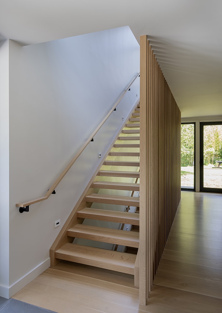 The pool, edged by concrete decking and lush greenery, acts as the home’s surrogate waterfront, reinforcing Lilley’s decision to orient the design toward outdoor life. Steps created by Blue Claw’s team descend toward trails in Beebe Woods, which the family and their teenage son explore often.