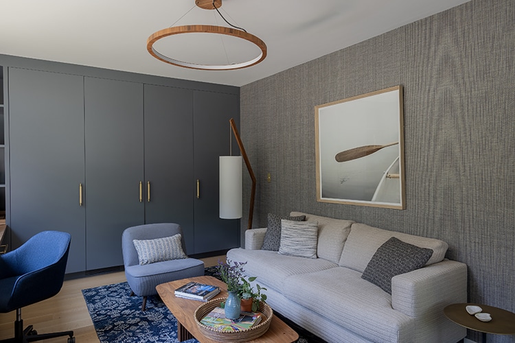 The material palette pairs white oak with rich walnut, a personal favorite of Dave’s. “I’ve always loved walnut,” he says. “It’s warm, it’s timeless, and it balances the modern elements with something grounded in history.” Walnut paneling appears in the living room, office, and even the primary closet, threading a consistent language of depth and texture.
